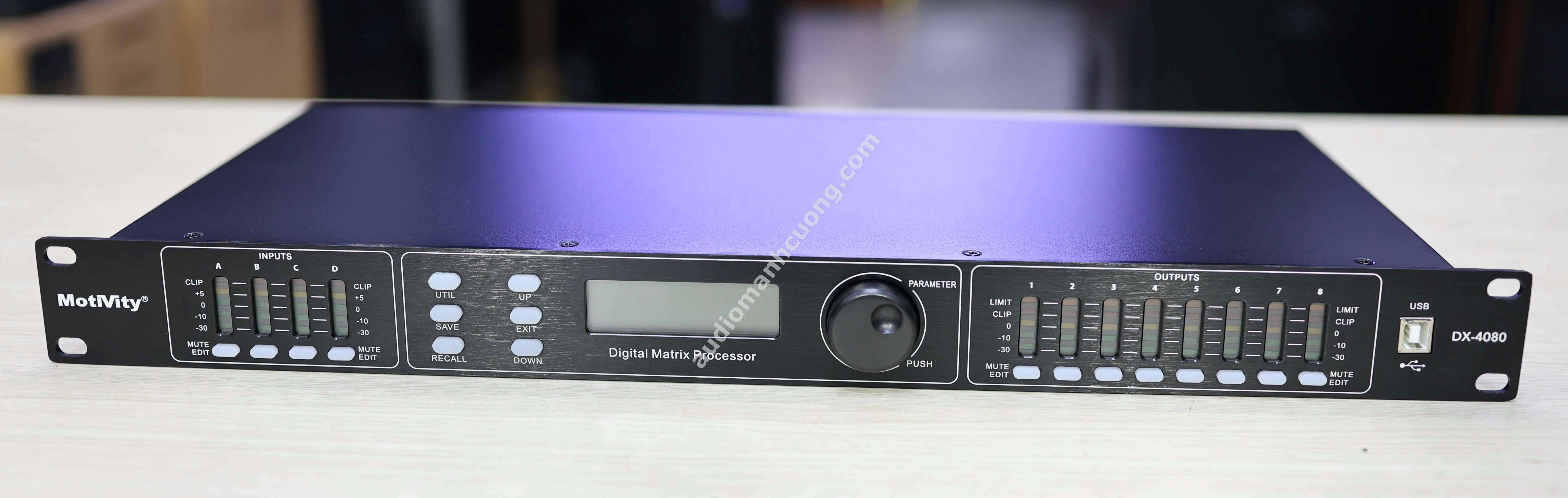 Motivity DX4080 là thiết bị xử lý tín hiệu số (digital crossover) chuyên nghiệp với cấu hình mạnh mẽ 4 đầu vào và 8 đầu ra. Sản phẩm được đánh giá cao trong các hệ thống âm thanh karaoke cao cấp, sân khấu biểu diễn, hội trường, phòng họp, sự kiện...